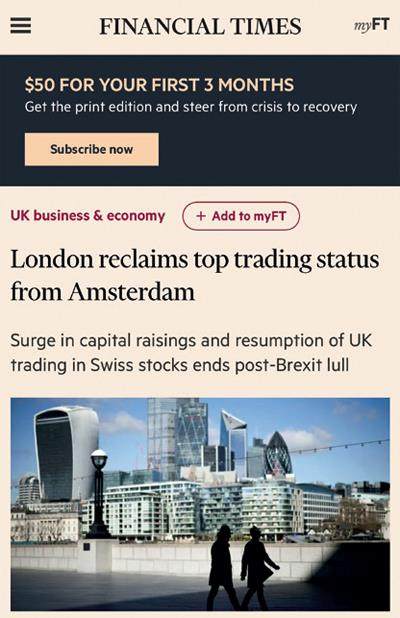 伦敦重新夺回欧洲交易中心宝座 英国《金融时报》7月3日 英国脱欧后,伦敦作为欧洲最大股票交易中心的地位一度被阿姆斯特丹取代,现在伦敦夺回了这个宝座。 英国脱欧后,欧洲大陆股票交易的格局被重塑,欧盟机构不能再通过伦敦进行股票交易。今年1月,伦敦的大部分股票交易转去荷兰首都阿姆斯特丹,超过64亿欧元的交易在一夜间离开伦敦,前往符合欧盟法律规定的新交易场所。数据显示,通常占欧洲日均交易量约1/