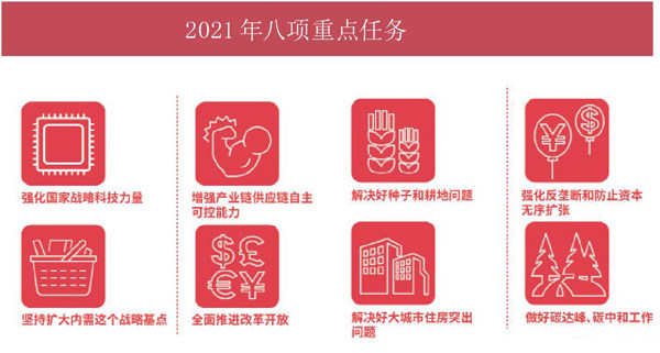 要闻 2021年八项重点任务 中央经济工作会议在北京举行 2020年12月16-18日,中央经济工作会议在北京举行。中共中央总书记、国家主席、中央军委主席习近平,中共中央政治局常委、国务院总理李克强,中共中央政治局常委栗战书、汪洋、王沪宁、赵乐际、韩正出席会议。 习近平在会上发表重要讲话,总结2020年经济工作,分析当前经济形势,部署2021年经济工作。会议认为,今年是新中国历史上极不平凡