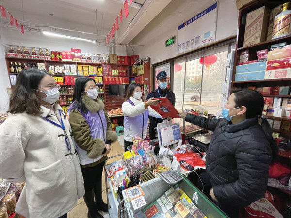 向辖区商户送祝福 提起张家港市金港镇金都社区,总让人不由自主地想到一支靓丽的队伍——“菁英地带”巾帼志愿服务队。“菁英地带”由社区妇联牵头成立,截至目前共有成员20余人。成立两年来,“她们”付出汗水,收获喜悦。2021年春节前夕,如何吸引社区的2200多外地居民留下就地过年成了“菁英地带”的课题,而打造温情满满的“家”,让新邻居在“家里”齐享幸福年就是她们的答案。 “她”带头,留在“志愿家”过