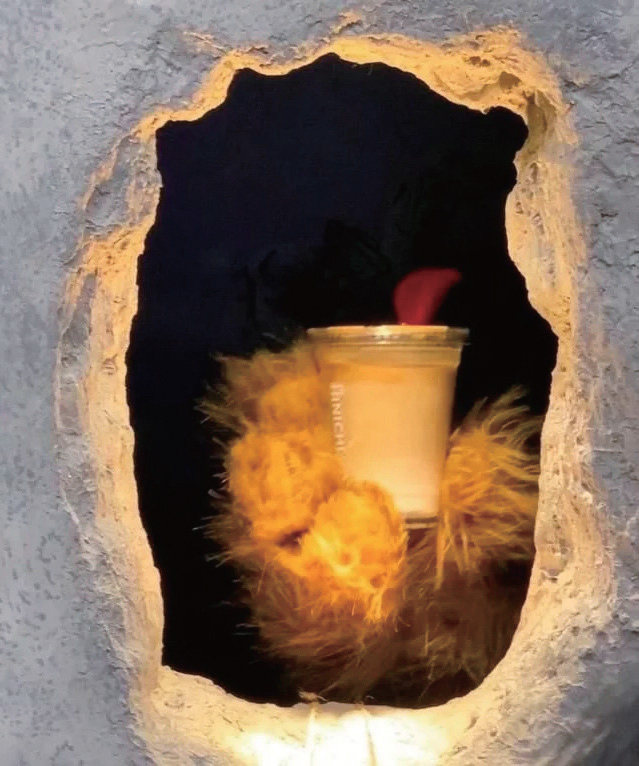 熊爪咖啡店 2020年冬天,上海徐汇区永康路68号的外墙上被砸出了一个洞,洞口前排起了长队。每隔几分钟,一只毛茸茸的棕色熊爪从洞口伸出来,递出一杯做好的咖啡。客人接过咖啡后,熊爪还会比心、招手,再来段熊爪舞。和熊爪互动后,很多人脸上不自觉地挂上了微笑,有个小朋友轻轻摸了摸熊爪后,兴奋得手舞足蹈。 用洞口连接咖啡师和客人 这个洞口其实是家咖啡店,没有大门,没有招牌,除洞口外,其余地方被水泥墙封