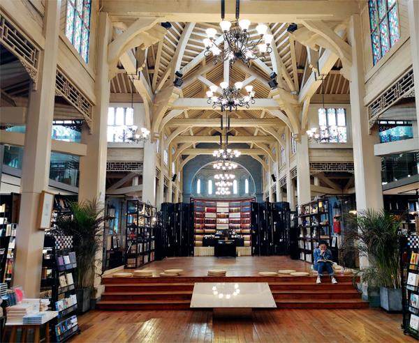 模范书局在对百年教堂改造中,花费了不少心思。加固原初的建筑,室内本体建筑保持原样,在不破坏原来格局的基础上增加了一些现代实用性。如果只是站在书局门口很难看出这里是书店。 掀开不起眼的布帘子、踩着吱吱呀呀的斑驳木地板,一个舒朗、开阔的诗意空间就在眼前。整个教堂原本的座椅区清理一空,书架分列两旁,留下游览空间,原先中央的洗礼池,被改造为一个小舞台,结合高耸的穹顶,显得书局格外的空旷。