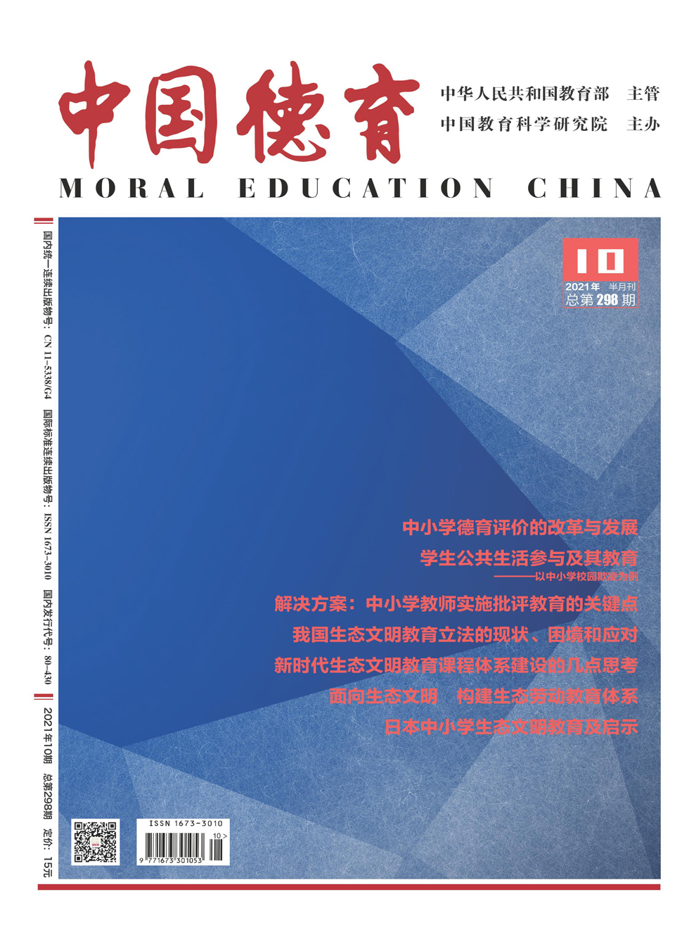 在加快推进教育现代化、建设教育强国、办好人民满意教育的新征程中,党中央就教育改革发展提出一系列新理念新思想新观点,为我们新时代教育事业发展指明了方向。把握好中央的教育精神、落实好国家的教育政策,是推进教育进一步改革发展的关键。《中国德育》特开设专栏,解读教育的“顶层设计”,探讨教育的“奋进之笔”,以期为教育改革发展助力。 摘 要 教育评价改革进程中,德育评价作为薄弱环节应予关注。中华人民共和国
