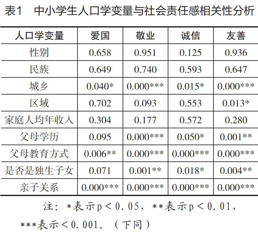 摘 要 社会主义核心价值观中的“爱国、敬业、诚信、友善”可视为中小学生社会责任感的主要内容。以中小学生为调查对象,以学生的社会责任感情况为主要调查内容,基于10所中小学、960份有效问卷数据,分析得到影响中小学生社会责任感的因素主要有城乡、父母教育方式、亲子关系、是否为独生子女、父母学历和区域,其社会责任感水平在这6个方面存在显著性差异。基于分析结果,本研究认为应该从学校、父母、个人三个层面出发