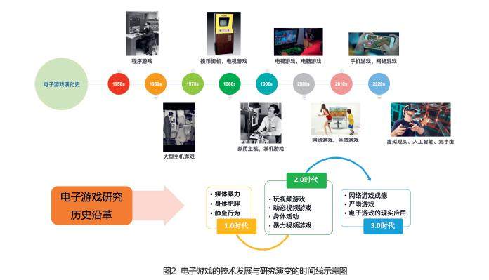 科学的进步与技术的发展推动了电子游戏的演变,也促进了学者们研究视角的转换。整体而言,电子游戏的演进与其对儿童发展的影响研究大致可以分为3个历史阶段(见图2与图3): 电子游戏1.0时代 电子游戏起源于20世纪50年代,那时一些早期的计算机科学家开始使用游戏来测试其程序的局限与可能性。在20世纪60年代,随着大型主机在政府、商业、大学实验室的普及,正式的电子游戏应运而生。譬如,1962年麻省理工