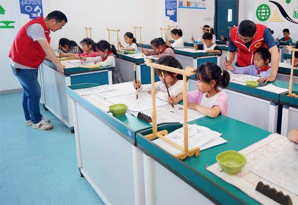 “报春使”文化公益培训社书法培训班 “每月毛笔书法课4节、硬笔书法课4节,所有培训都是免费的。”由张报发起的公益培训活动,累计培训时长已超600小时,培训留守儿童9000余人次。 张报,蚌埠市淮上区曹老集镇综合文化服务中心主任。他和蚌埠市淮上区曹老集镇敬老院院长史超、蚌埠市西门渡小学校长郑春阳一起组建了“报春使”文化公益培训社。 关爱留守儿童,传承传统文化,这是他们筹办公益培训的初衷。 除
