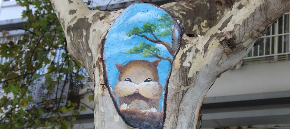 有细心的市民发现,南京秦淮区部分道路、街巷的行道树的树干上出现了色彩鲜艳的动物彩绘:松鼠、瓢虫、颈鹿、加菲猫、鹦鹉……这些可爱的动物“爬上”枝头,让过往行人在不经意间收到一份惊喜。据报道,该地在治理辖区行道树“树洞”等常规树木病害时,对部分树木在创口“包扎好”的基础上施以彩绘,成为“最萌创可贴”。 “树洞”是常见的一种树木病害。行道树因为日常的修剪、各种意外造成树枝折断等因素,会在树木的不同