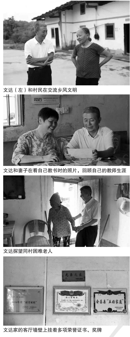江西省赣州市会昌县站塘乡横岭村的七旬老人文达不仅乐于做好事,而且“上了瘾”。行人有困难向他求助,他从不推脱;村民有事来找,他有求必应。因为热心公益、乐于助人,文达被村民誉为“当代活雷锋”,其家庭荣获“2020年全国最美家庭”称号。 贷款借钱,帮助学生 1974年,从师范学校毕业的文达回到家乡江西省赣州市会昌县站塘乡当小学教师。从教38年,他先后辗转了4所村小学。本有多次机会调到镇上的小学任教,