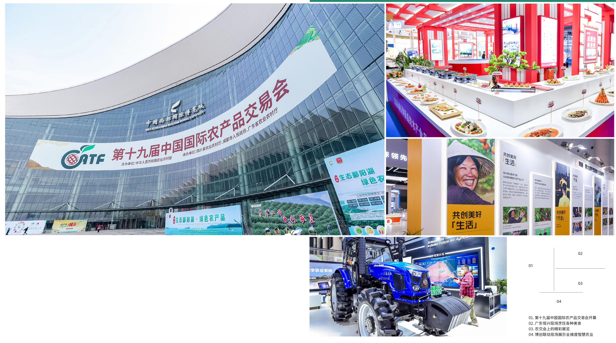 12月22日,第十九届中国国际农产品交易会在成都市开幕,1.7万家展商携8万余种展品参展,全国各地专业采购商超2万人参加。本届农交会为期4天,展览面积近15万平方米,设立特大企业展区和粮油、水产、果蔬等12个专业展区,其中农业无人机、农业无人车等高科技设备,让观众眼前一亮。 01. 第十九届中国国际农产品交易会开幕 02. 广东恒兴现场烹饪各种美食 03. 农交会上的精彩展览 04. 博创