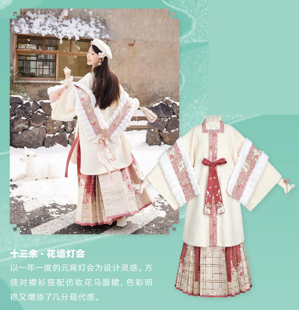 近年来,基于中华优秀传统文化的创造性开发而兴起的“国风热”,成为不可忽视的社会文化现象。“国风穿搭”频频出圈。汉服行业在国潮流行趋势下,近几年不断发展,数据显示,汉服文化年销售额已超20亿元。新春来临,各大汉服品牌相继推出2023兔年新春限定款。汉服市场又会在购物狂欢中带来怎样亮眼的成绩呢? 十三余 · 花墙灯会 以一年一度的元宵灯会为设计灵感。方领对襟衫搭配仿妆花马面裙,色彩明艳又增添了几分