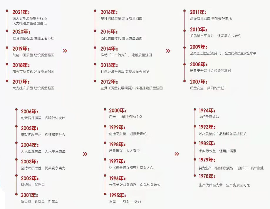 1978至2021,我国“质量”的发展史上,谱写出一段激情燃烧的历程。 从第1个“质量月”的久旱逢甘霖,到第10个“质量月”的势如破竹,再到如今第34个“质量月”的激情澎湃。44年间,一代又一代中国品牌人攻克难关、勇毅前行,将“高质量”的标签牢牢贴上中国制造的品牌。 犹记“质量月”成立之初,我国国民经济刚刚恢复,企业生产效率低、质量问题严重,各级领导分头到全国各地检查产品质量。期间,不仅有厂长