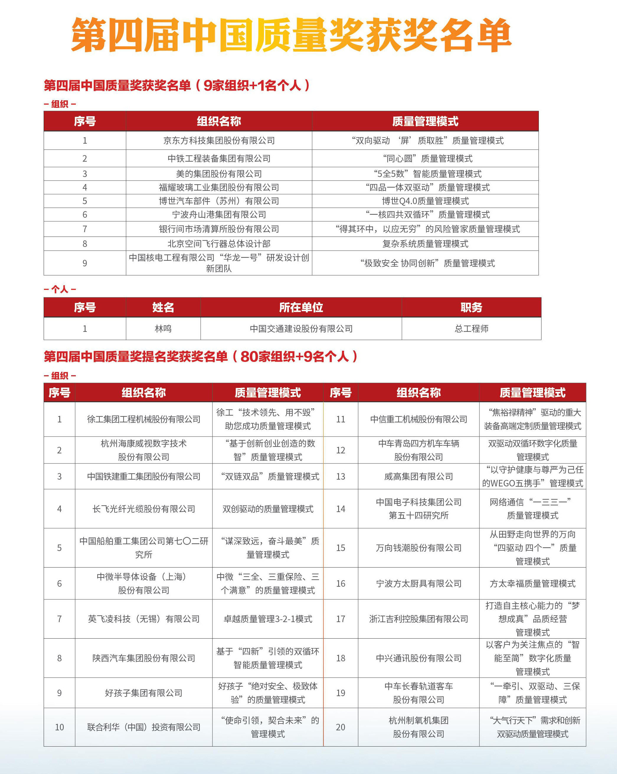 第四届中国质量奖获奖名单(9家组织+1名个人) 第四届中国质量奖提名奖获奖名单(80家组织+9名个人)