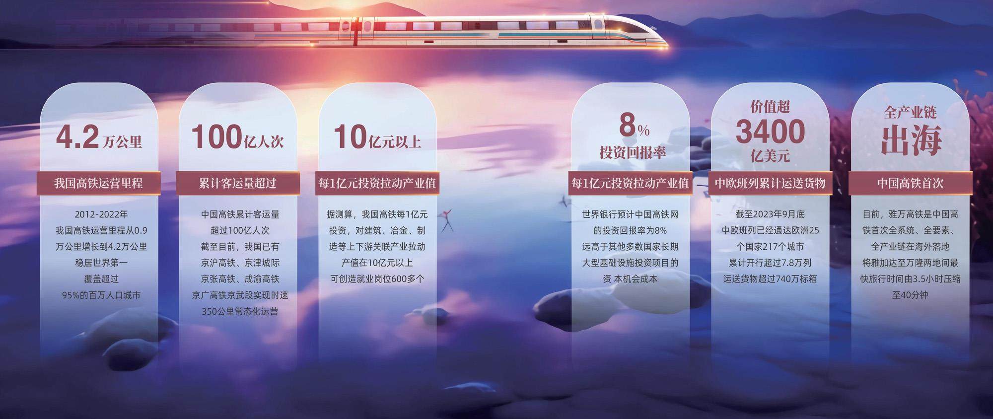 俯瞰中国,一列列高铁宛如银龙飞驰在华夏大地。 “和谐号”“复兴号”,一代代更新的车型,刷新着“中国速度”,也见证着中国高铁近十年的发展历程。从“追赶者”到“领跑者”,从一无所有到自主创新,中国高铁在坎坷曲折中唱响波澜壮阔的品牌之歌。 共建“一带一路”十年来,我国高铁运营里程从0.9万公里增长到4.2万公里,累计客运量超过100亿人次。“八纵八横”高铁网正加密成型,全国99%的20万人口以上城市
