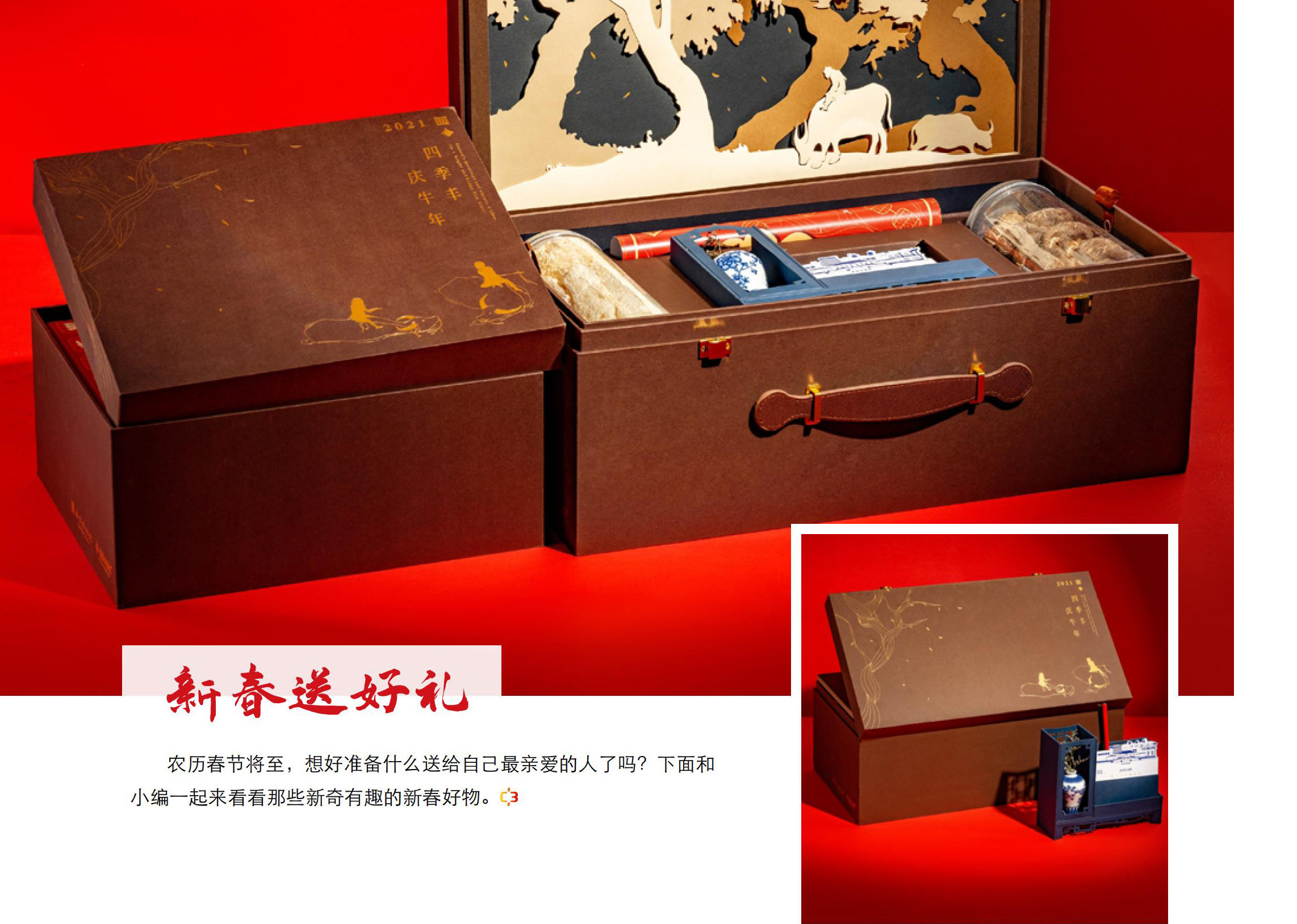 南京大牌档与南京博物院跨界合作,推出“四季丰 庆牛年”2021新年礼盒,设计灵感源自南京博物院藏品《四季牧牛图》。古雅的包装设计,加上富有南京特色的文创商品及食物,让人忍不住想要剁手。