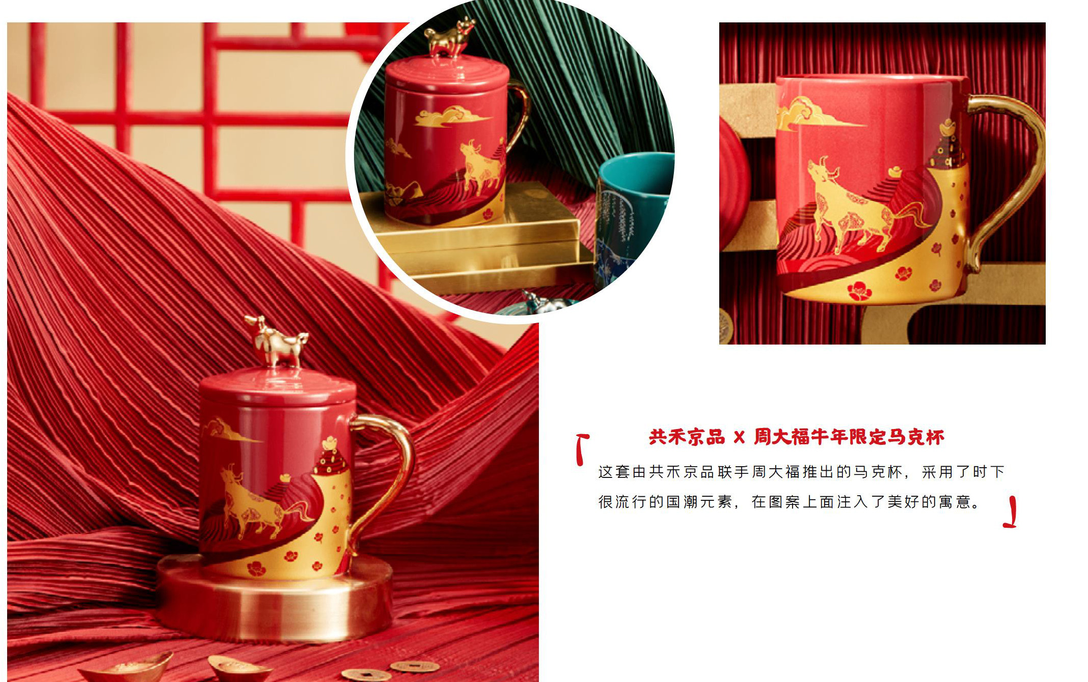 这套由共禾京品联手周大福推出的马克杯,采用了时下很流行的国潮元素,在图案上面注入了美好的寓意。