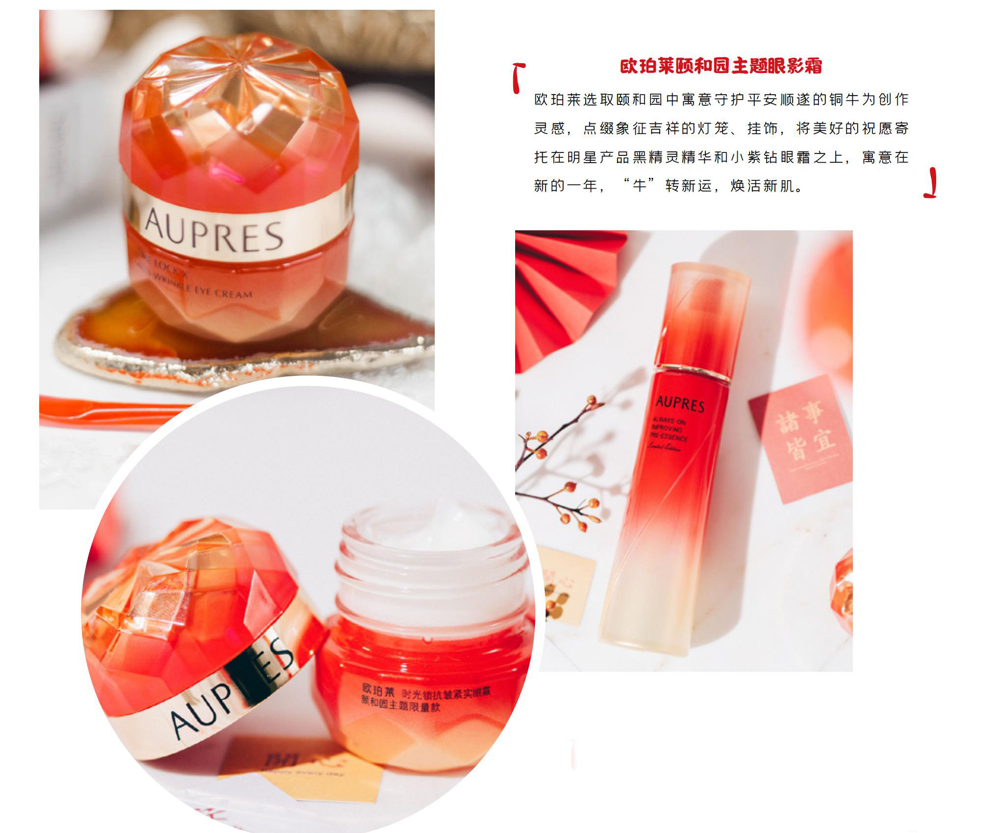 欧珀莱选取颐和园中寓意守护平安顺遂的铜牛为创作灵感,点缀象征吉祥的灯笼、挂饰,将美好的祝愿寄托在明星产品黑精灵精华和小紫钻眼霜之上,寓意在新的一年,“牛”转新运,焕活新肌。