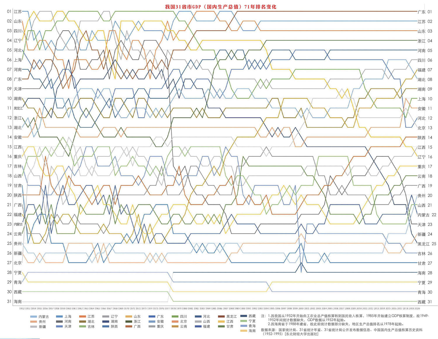 2020年我国GDP突破百万亿,相比新中国成立初期的679.1亿增长了近1500倍。里程碑式的成绩,是成就也是起点。回顾过去71年发展历程,我国经济总量从百亿到万亿经历了37年,从十万亿到五十万亿用了12年,翻番到百万亿则只用了8年。这些时间数字表现出一种突破性的发展速度。31省中哪些省市是推动我国经济逆风航行的强势动力?谁又是搅动中国区域经济格局的上升力量?在全国31省71年GDP排名变化中,有