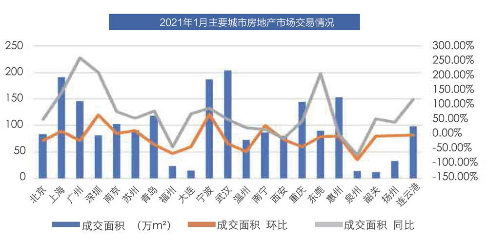 2月,正逢春节假期,受新冠肺炎疫情影响,多省市倡导“就地过年”,居民返乡置业意愿或将有所下降,就地买房意愿可能提升,预计部分热点城市房价仍有上涨压力。 楼市成交量下行 但并非普遍下调 2021年1月,主要城市成交面积环比下降18.55%,其中一线城市成交面积环比下降2.24%,其中广州、北京降幅相近,均超21%。从中国指数研究院数据来看,重点城市中,上海和深圳成交量出现井喷现象,一线城市同比上
