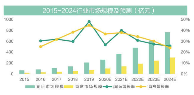 仿佛忽然之间,潮流玩具门店成为了商场和购物中心客流最大区域,尤其是以泡泡玛特为代表的盲盒品牌发展迅猛,展现出极高的客户吸引力。伴随几大盲盒品牌的融资甚至上市,盲盒经济的吸金能力也不可小觑。 面对快消市场新风口,消费者、商家、渠道和投资者都准备好了吗? 盲盒市场体量有望突破300亿元 在国内,从2016年开始,中国潮玩市场整体快速增长。潮流玩具主要分为手办、盲盒和BJD娃娃。其中,盲盒板块增长