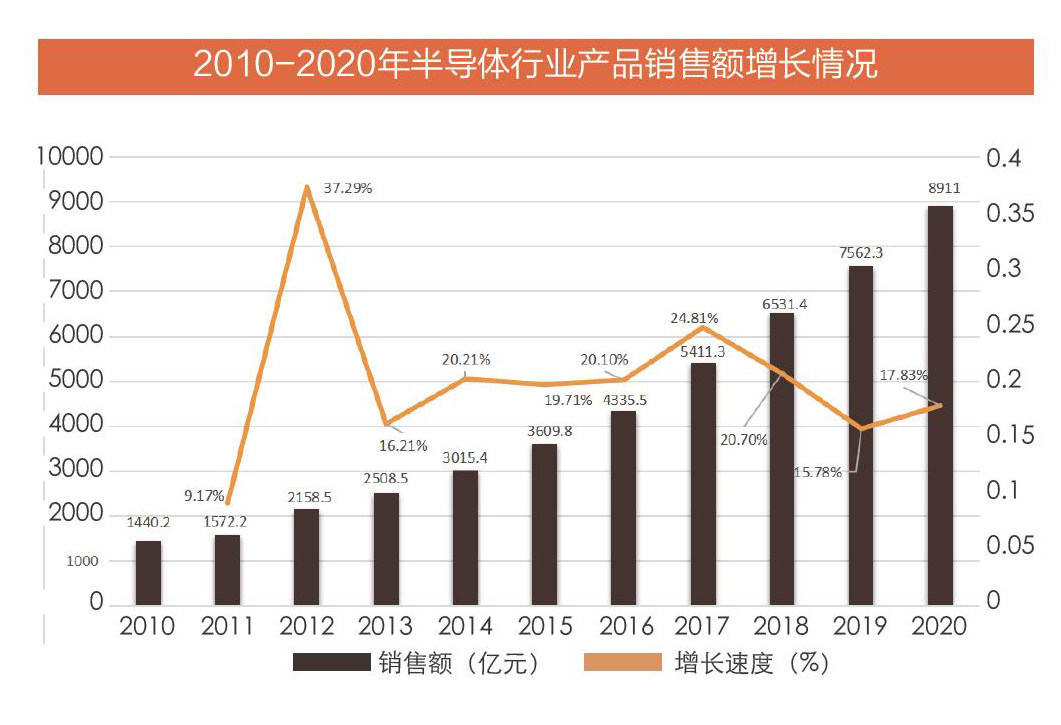 在政策、市场等众多因素的推动下,我国芯片产业发展不断向上。但一些关键问题,如核心技术、人才等,依旧等待各方去共同解决 何时销售过万亿 2010年以来,中国芯片产业,以每年超9%的速度的高速增长,至2020年半导体行业销售额已达8991亿人民币,2021年销售额能否过万亿值得期待。 市场规模稳步提升 伴随着半导体产品销售额的增长,中国大陆半导体市场规模占全球比重也在稳固上升。至2020年中国