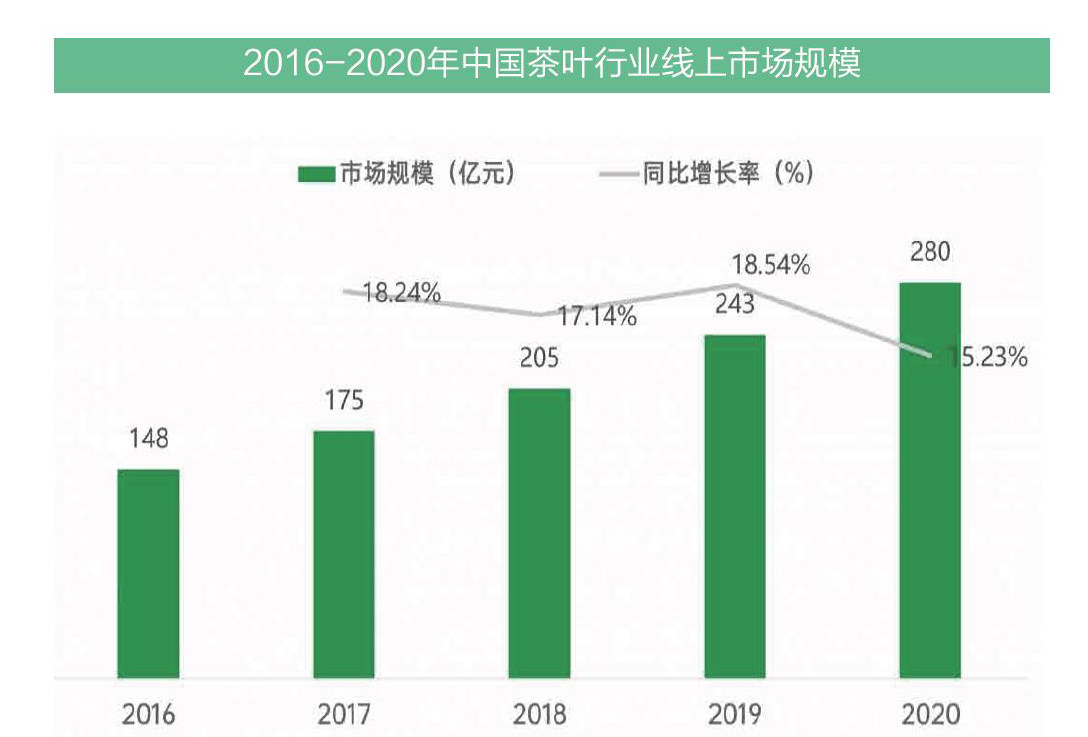 在茶叶消费这件事上,中国在世界上都是“大户”,2019年585.9万吨的世界茶叶消费总量中,39%是中国消费掉的。由于疫情原因,国内茶产业陷入停摆状态,但却更深层次地改变了销售渠道。“宅经济”红利作用于茶产业,其线上市场规模正迎来一波巨大流量 线上市场规模近300亿 2016年至2020年,中国茶叶线上市场规模一直呈稳步增长态势,从2016年的148亿元,到2020年已经达到280亿元。201