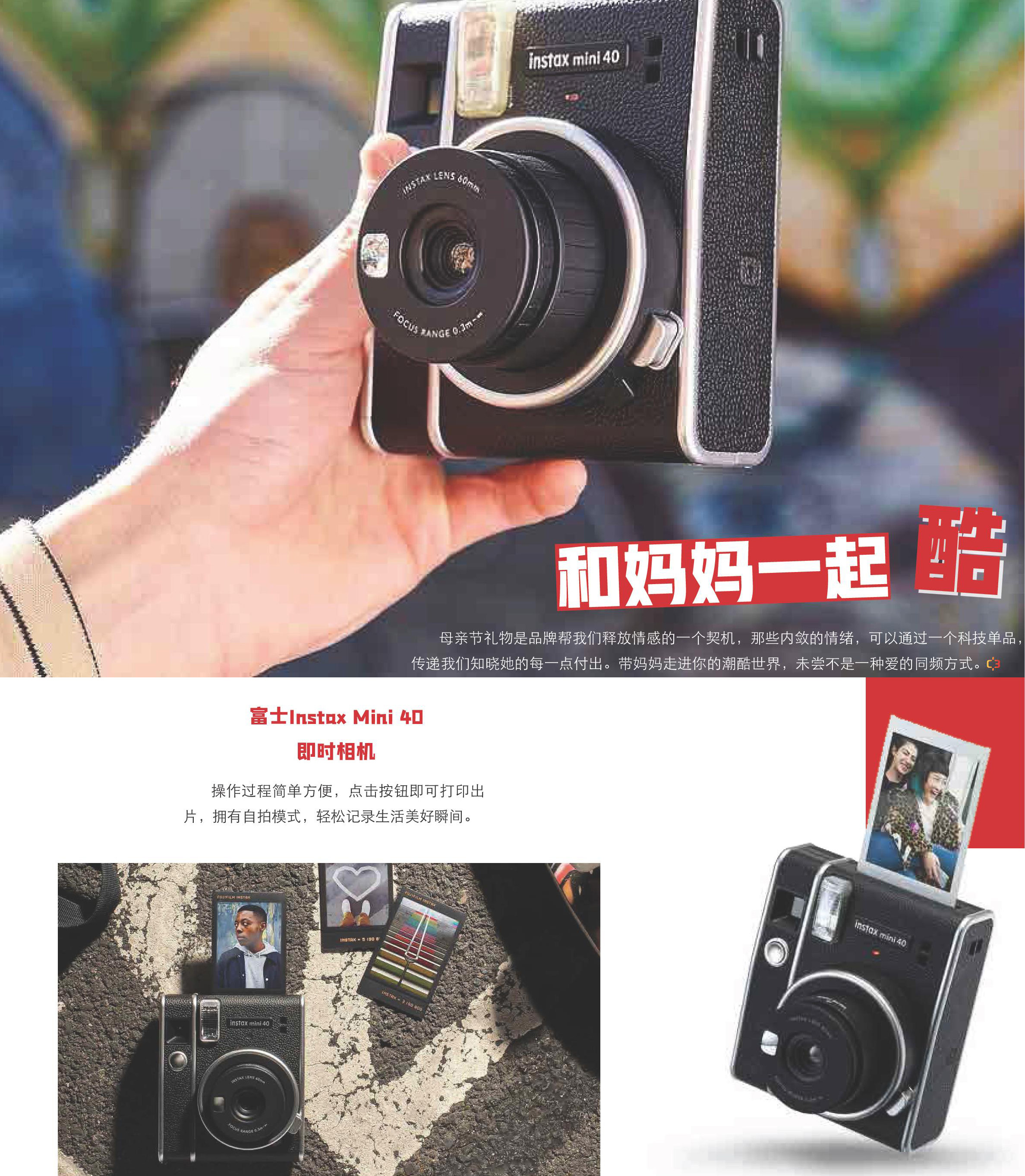 母亲节礼物是品牌帮我们释放情感的一个契机,那些内敛的情绪,可以通过一个科技单品,向妈妈传递我们知晓她的每一点付出。带妈妈走进你的潮酷世界,未尝不是一种爱的同频方式。 富士Instax Mini 40 即时相机 操作过程简单方便,点击按钮即可打印出片,拥有自拍模式,轻松记录生活美好瞬间。