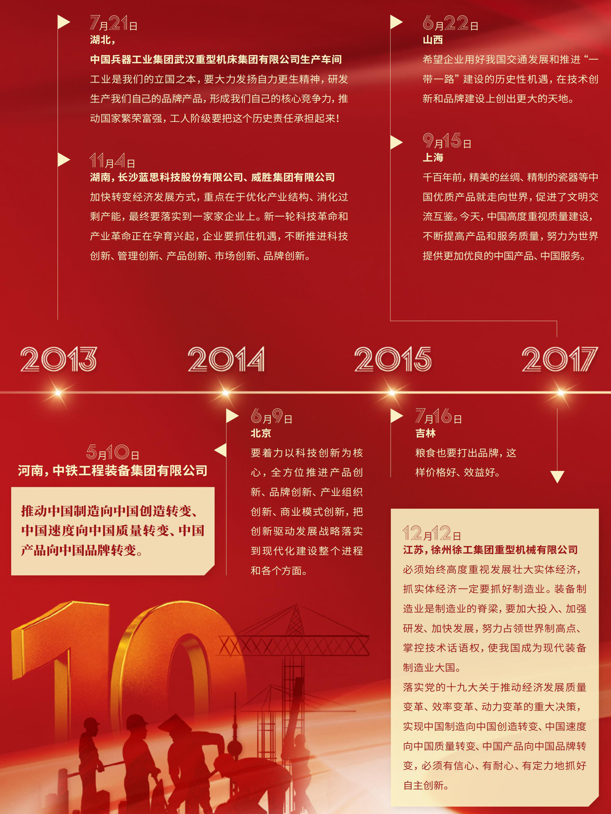 7月21日 湖北, 中国兵器工业集团武汉重型机床集团有限公司生产车间 工业是我们的立国之本,要大力发扬自力更生精神,研发生产我们自己的品牌产品,形成我们自己的核心竞争力,推动国家繁荣富强,工人阶级要把这个历史责任承担起来! 11月4日 湖南,长沙蓝思科技股份有限公司、威胜集团有限公司 加快转变经济发展方式,重点在于优化产业结构、消化过剩产能,最终要落实到一家家企业上。新一轮科技革命和产
