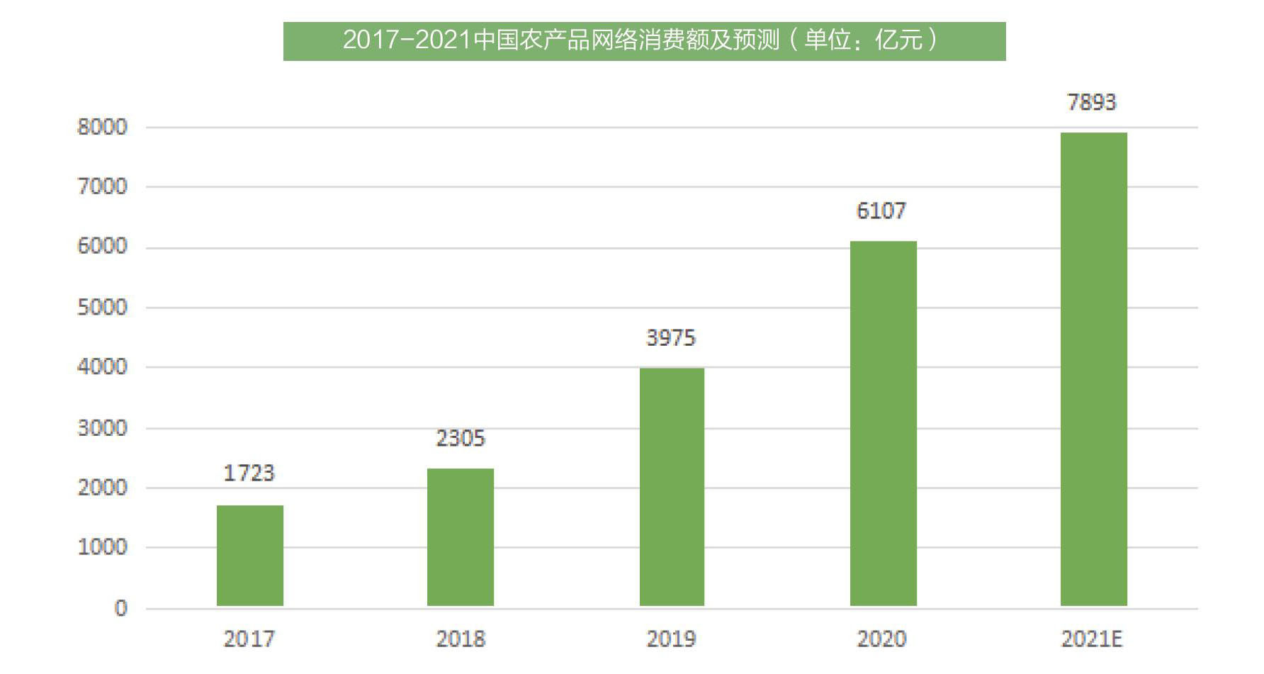 随着电商新业态模式层出不穷,中国农产品在线上渠道大展身手,迈入消费新发展阶段。2021年,农产品线上消费规模有望接近8000亿。 网络零售额逐年迅猛攀升 艾媒咨询数据显示,中国农产品在线上渠道的消费规模不断扩大,2020年已达到6107亿元,2021年有望接近8000亿。电商平台积极推动农产品在线上渠道销售,同时直播电商、拼团等新兴业态使农产品能够接触更大规模消费者,因此其网络零售额逐年迅猛攀