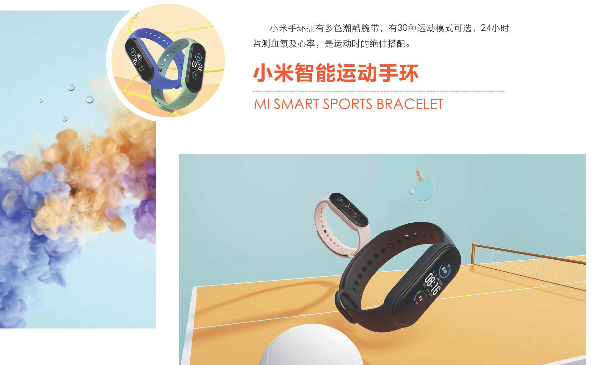 小米手环拥有多色潮酷腕带,有30种运动模式可选,24小时监测血氧及心率,是运动时的绝佳搭配。