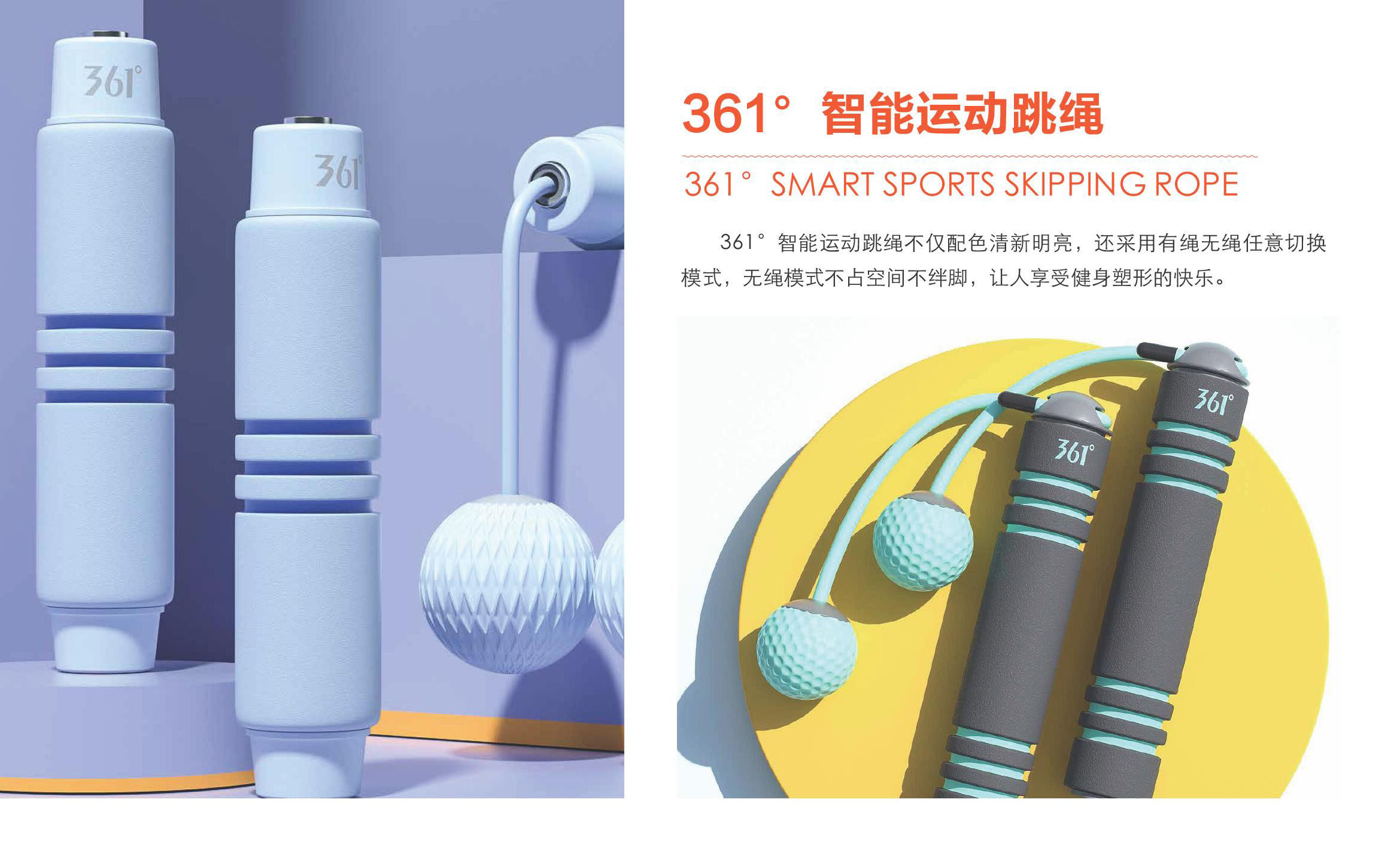 361°智能运动跳绳不仅配色清新明亮,还采用有绳无绳任意切换模式,无绳模式不占空间不绊脚,让人享受健身塑形的快乐。