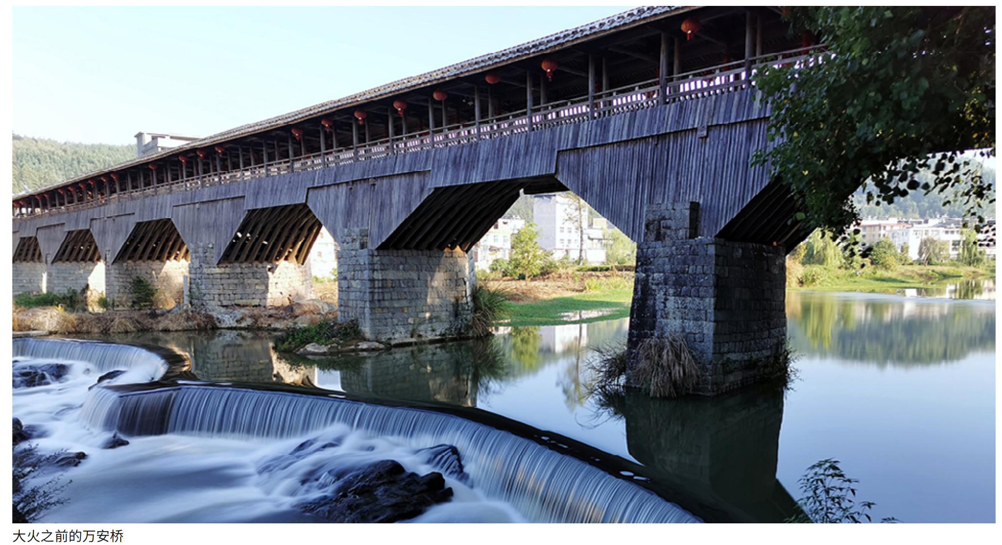 木拱廊桥,不仅是历史文化遗产,也承载着民族精神生生不息的根脉 8月6日晚,全国重点文物保护单位——福建屏南县万安桥突然失火,桥体几乎被全部焚毁。 万安桥横跨在中国传统村落与省级历史文化名村棠口村、长桥村之间,当一位村民赶到桥边,火光已经照亮半边天,被火焰裹挟的万安桥在浓烟中发出“噼里啪啦”的声音,烧成半截的木头带着火星持续掉落水中。木桥燃烧了40多分钟,明火才被扑灭。 这座凝结着闽北人乡愁的