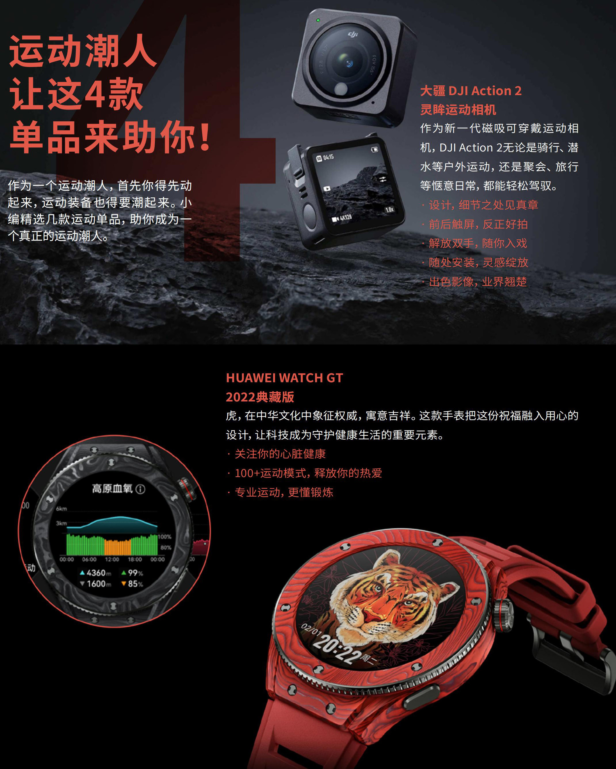 作为一个运动潮人,首先你得先动起来,运动装备也得要潮起来。小编精选几款运动单品,助你成为一个真正的运动潮人。 大疆 DJI Action 2 灵眸运动相机 作为新一代磁吸可穿戴运动相机,DJI Action 2无论是骑行、潜水等户外运动,还是聚会、旅行等惬意日常,都能轻松驾驭。 · 设计,细节之处见真章 · 前后触屏,反正好拍 · 解放双手,随你入戏 · 随处安装,灵感绽放 · 出