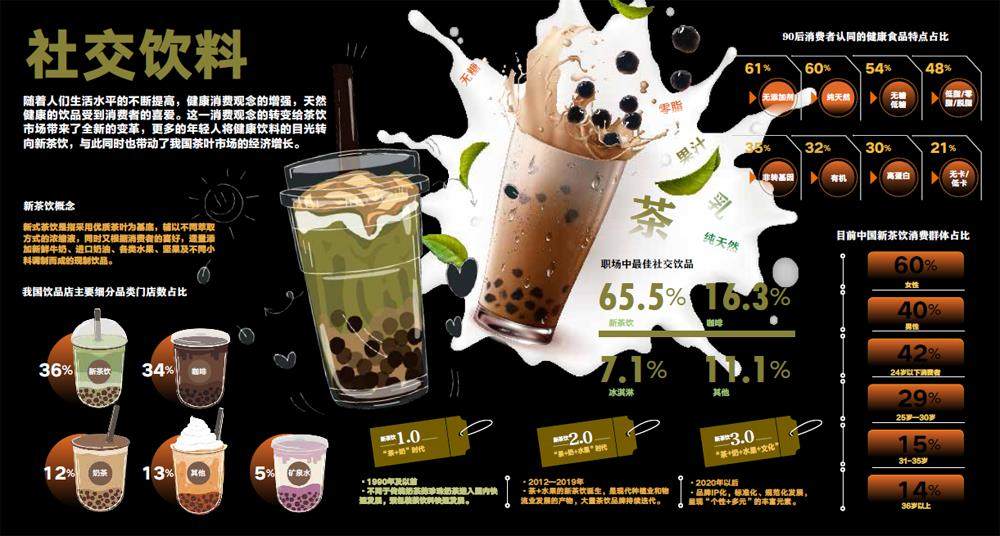 随着人们生活水平的不断提高,健康消费观念的增强,天然健康的饮品受到消费者的喜爱。这一消费观念的转变给茶饮市场带来了全新的变革,更多的年轻人将健康饮料的目光转向新茶饮,与此同时也带动了我国茶叶市场的经济增长。 新茶饮概念 新式茶饮是指采用优质茶叶为基底,辅以不同萃取方式的浓缩液,同时又根据消费者的喜好,适量添加新鲜牛奶、进口奶油、各类水果、坚果及不同小料调制而成的现制饮品。