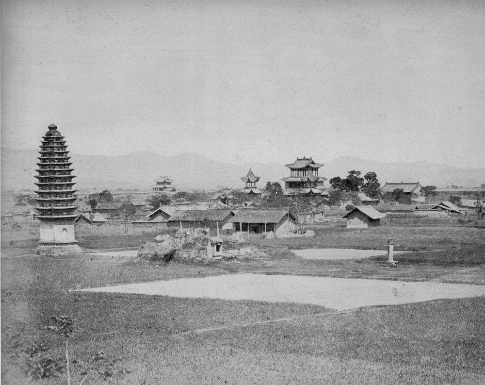开明寺塔,始建于唐朝开元中期。塔为方形13层密檐式砖塔,北面正中设券门,内辟方形小室。塔身自二层以上各面均有佛龛,内有石雕佛像,各层均自下而上逐层缩小叠涩出檐,并施菱角牙子。塔顶叠涩覆钵形收束,置八棱刹柱及宝盖。整体建筑古朴雄峻,结构精致优美。阿道夫·伊拉莫维奇·鲍耶尔斯基 (Adolf Erazmovich Boiarskii,俄罗斯摄影师、翻译,生卒年不详)拍摄于陕西,1874—1875年