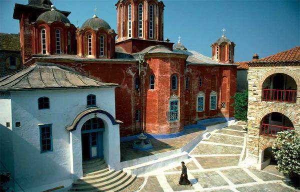 阿索斯山上的修道院内景。 谈到爱琴海,有句话总是被人提起:“上帝在造这片海域的时候,一定是打翻了蓝色颜料瓶。” 这片面积约等于中国安徽省的神奇海域竟然散布着大大小小2500个岛屿,古希腊的船员甚至可以直接以肉眼可见的岛屿作为航海指南,而蓝白两色是这里的主色调。 仔细察看爱琴海地图就会发现,打翻蓝色颜料瓶的那只“上帝之手”,甚至也隐隐现出了真容。它就是形如“三根手指”的岛屿——哈尔基季基半岛。这