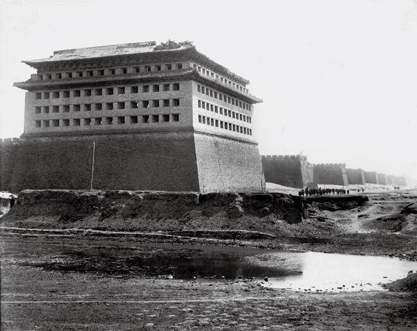 内城东南角楼。明代北京内外城各建有4个角楼,角楼沿城台外缘建起,四面砖垣,重檐歇山顶,四面箭窗孔共144个,是一座既可瞭望又可警戒的军事防御建筑。城墙每隔一定距离就突出的矩形墩台称“马面”,在军事设防中起到避免视野死角、增大城墙面积、增强墙身刚度的作用。 恩斯特·柏石曼(Ernst Boerschmann,1873—1949年)拍摄于北京,1906年前。 清净化城塔,坐落于西黄寺殿后中