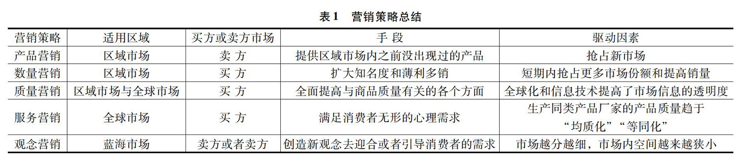 [摘 要] 随着经济的繁荣和科技的进步,市场中的商业活动日益频繁,从而推动了市场营销学中策略的更新与发展。文章通过适用市场范围、买方或卖方市场、手段和驱动因素这四个维度分析市场营销理论发展过程中各阶段的营销策略。通过了解每个阶段营销策略的具体情况和特征,可以更好地帮助企业在发展的不同阶段和所处的不同市场环境中清楚地选择对企业有利的营销策略。 [关键词] 营销策略;区域市场;消费者需求 [DO