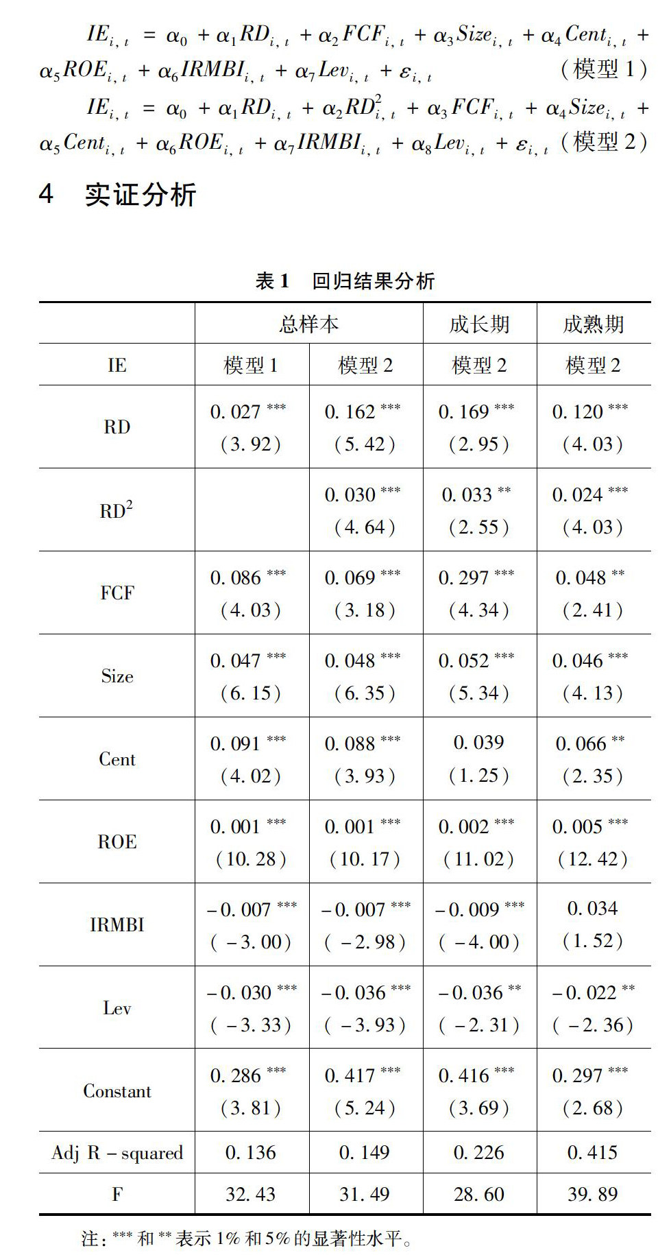 [摘 要]文章以2015—2019年国内A股制造业上市公司数据为研究样本,在研究R&D投入对投资效率影响的假设基础上,采用Dickinson的现金净流量组合法进一步提出处于不同生命周期的企业,其R&D投入对投资效率影响假设。通过构建多元线性回归模型最终得出结论:制造业企业R&D投入与企业投资效率之间呈现U型关系。处在不同生命周期的企业,其R&D投入对投资效率有不同的