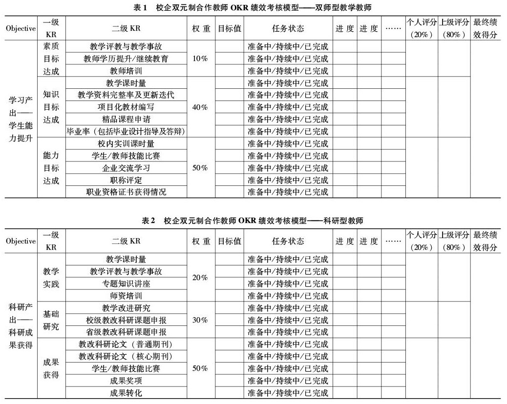 [摘要]随着经济形态的发展和变化,中国高等职业教育也面临着巨大的变革,其中典型的一处就是校企双元育人下的教师成分越来越复杂,传统的高校教师绩效评价体系早已不再适用。OKR的绩效考核体系特点与高等职业院校教师的需求不谋而合,基于此笔者提出了相关绩效考核模型。 [关键词]高等职业教育;绩效考核;OKR [DOI]10.13939/j.cnki.zgsc.2021.32 高等职业教育是指在大学专科