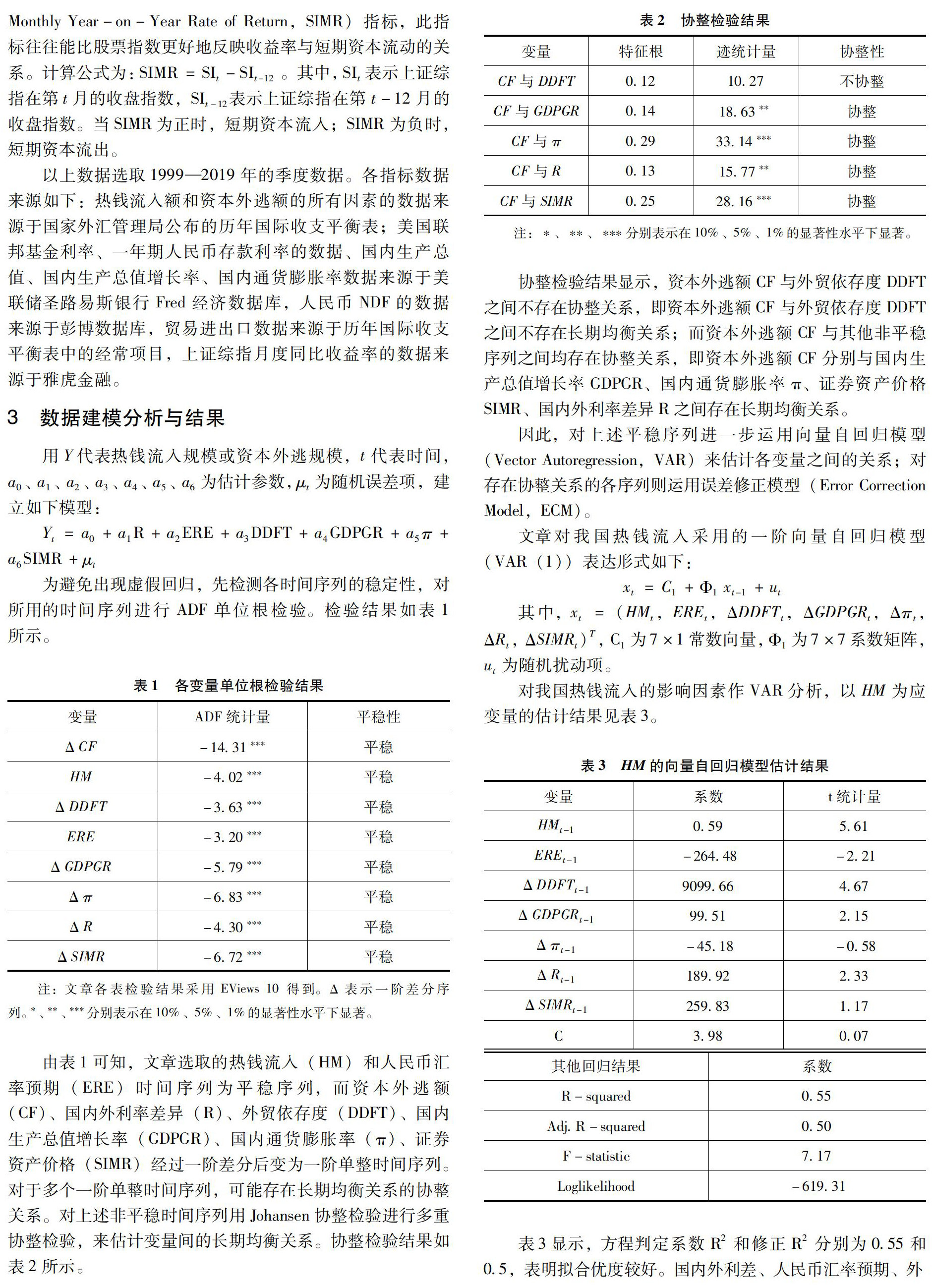 [摘 要]2019年9月10日,经国务院批准,国家外汇管理局决定取消合格境外机构投资者(QFII)投资额度限制,标志着中国资本市场高水平开放进入一个全新时代,跨境资本流动波动更加剧烈。在此背景下,讨论我国跨境资本异常流动,分析和影响因素之间的关系,有助于我国央行、外汇管理局监测和预警,保证宏观经济平稳运行和促进金融体系健康发展。文章用热钱流入规模和资本外逃规模代表跨境资本异动的指标,分析影响因素,