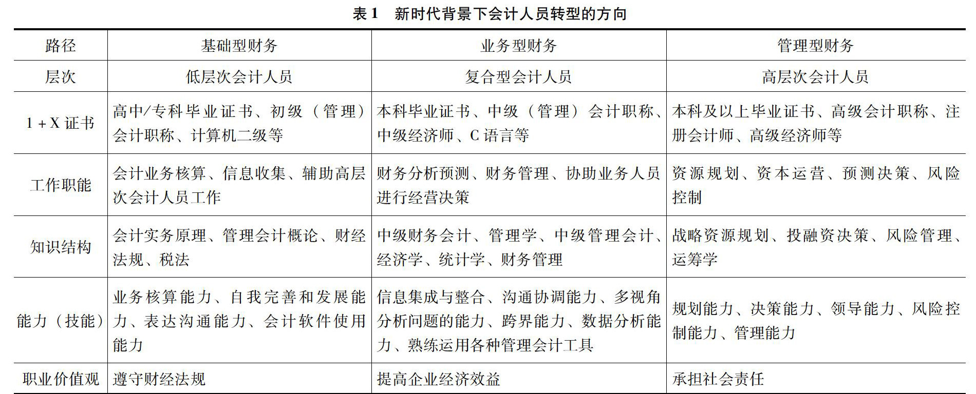 [摘 要]新时代背景下我国会计职业群体迎来新的机遇和挑战,在技术进步、企业发展、政策引导等多重驱动下会计人员转型势在必行。针对会计人员转型,确定转型方向和策略是重点。文章在对相关文献进行综述的基础上,从学历证书、工作职能、知识结构、能力(技能)、职业价值观五个方面分析了新时代背景下会计人员转型的三个方向——基础型财务、业务型财务、管理型财务,进而从企业和会计人员两个层面提出会计人员转型的对策及建议