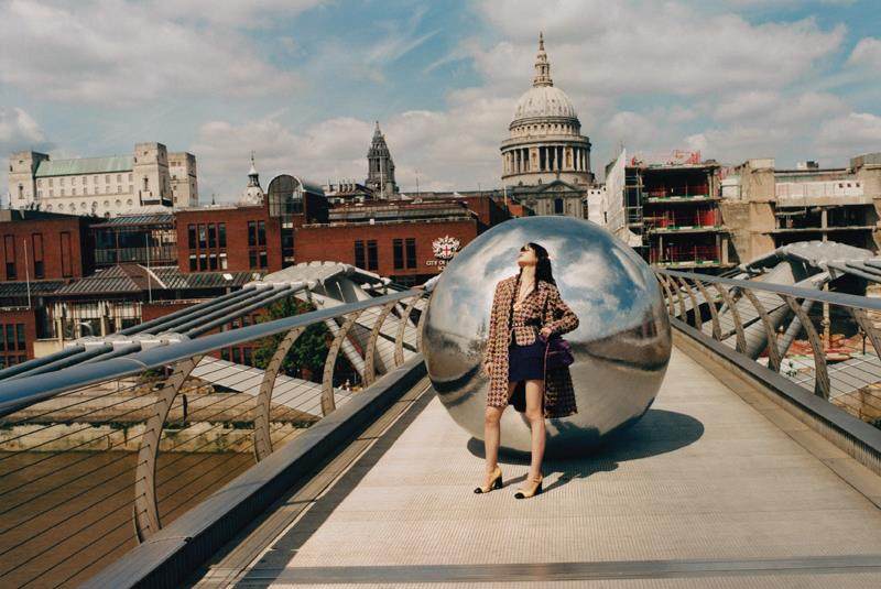 刺绣斜纹软呢外套及大衣、针织迷你裙、翻羊毛手袋、巴洛克风格吊坠项链、字母装饰腰链、字母吊坠耳环、金色手链、珍珠装饰双色高跟鞋均为Chanel 2021/22高级手工坊系列 光阴流转,恰似桥下的河水,流经不断变化的城市,流过岁月纺织的过往,也流向希望照见的未来。一步之遥,感受它的脉动,让梦驰骋。