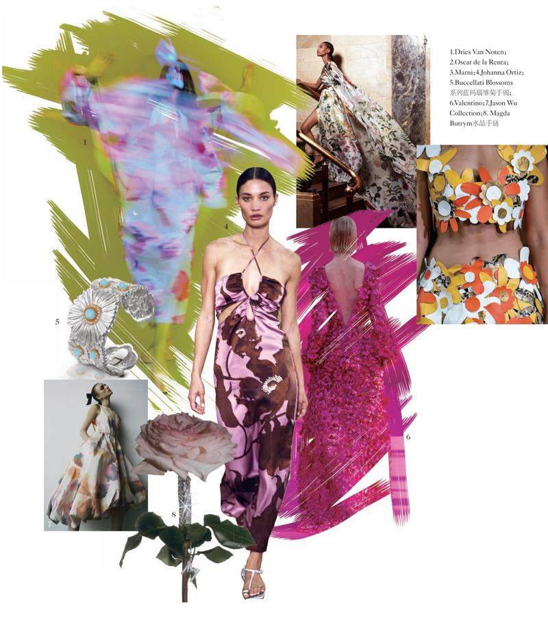 生如夏花 姹紫嫣红的花朵一直是时装设计源源不断的灵感之源,而说到以花为灵感的设计师,就不得不提Dries Van Noten,其对生命万物的关注赋予了他广阔的视角和丰沛的设计语言。在品牌2022春夏系列中,他用充满力量感的印度洒红节上高饱和的色彩、模糊处理的迷幻印花,带着我们闪回疫情之前那段可以肆意狂欢的时光,重新点燃我们心中对“dressing up”的时尚热情。而另一位善于盛装打扮的高手