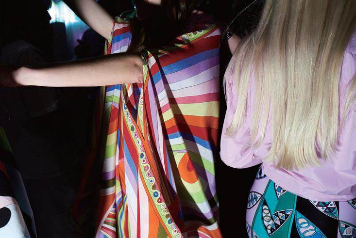 Pucci艺术总监 Camille Miceli和模特 Malika El Maslouhi在 Emilio Pucci位于米兰的工作室内。 Pucci的印花图案始终洋溢着生生不息的现代感,蕴含的欧式格调扑面而来,令人赏心悦目:如果要挑选一位时尚人士来作为Pucc这些特质的代表,Camille Miceli无疑是最佳人选。50岁的她是个法裔意大利人,在巴黎生活,大胆前卫,驻颜有术。在长达35年的