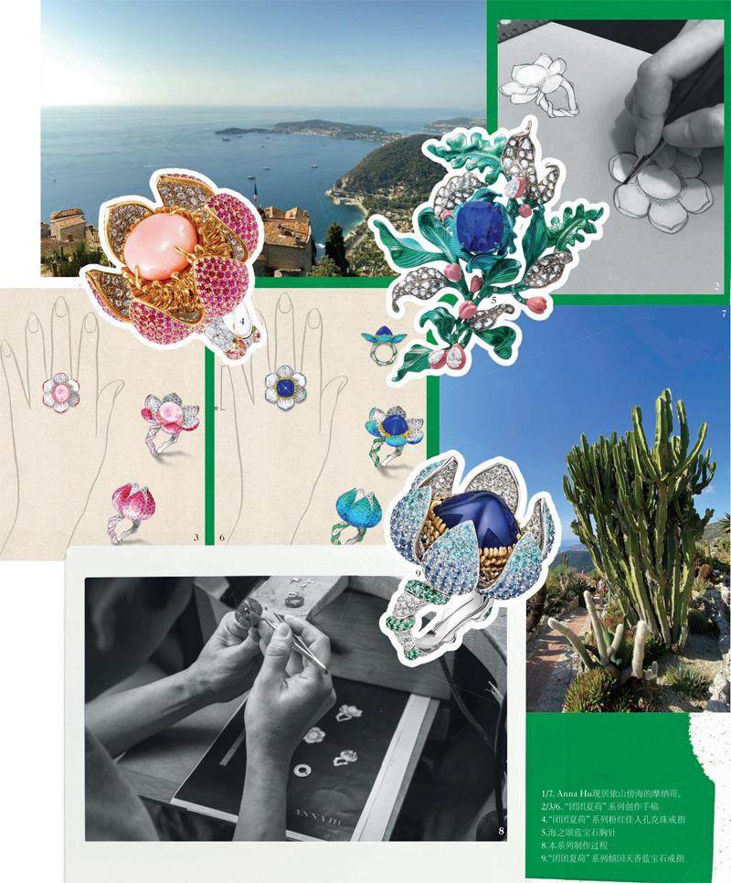 我从小就特别喜欢大海,大海是我在作品中常常不由自主为之咏叹的元素。特别是我现在就住在摩纳哥,正是一个依山傍海的城市,非常美,工作之余我很享受海边慢步的时光,大海一直都是我非常重要的灵感来源。 这次的海之颂系列全新作品仍然是以宝石作曲,咏叹浩瀚海洋的奥秘与生命力。我选择了一颗重达48.8克拉、闪耀着迷人海蓝色光芒的无烧缅甸蓝宝石作为主石,以各式切割的白钻作为映衬;以钛金属工艺打造轻盈的叶片,仿佛海