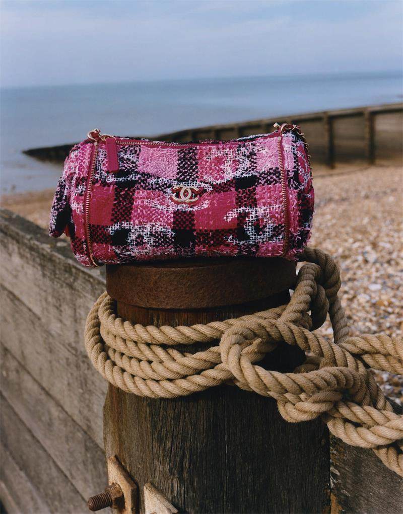 粉色链条单肩包Chanel 在滩头与海天一色间,有习习凉风拂来,吹皱粉红女人心。