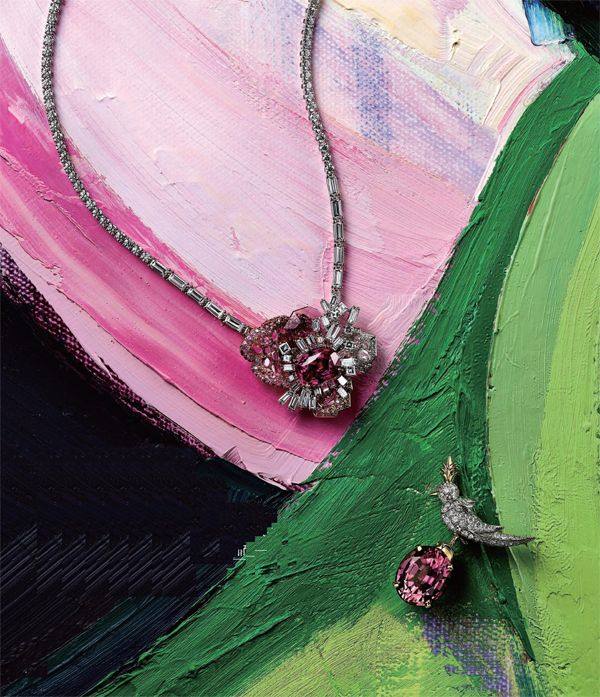 造型灵动的珠宝腕表跃然于女性艺术家张子飘的油画作品《芍药2》之上,生动的设计与盛放的姿态交相呼应,自由而鲜活的气息扑面而来。 花窗玫瑰造型红宝石项链Dior石上鸟造型胸针Tiffany&Co. 镶多种宝石发饰Harry Winston镶彩色宝石钻石手镯Chanel 渐变蓝宝石表圈自动上链腕表Audemars Piguet火焰型红宝石项链Harry Winston 悬浮镶嵌彩