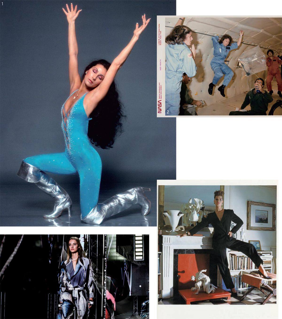 1.1978年,艺人Cher身着Bob Mackie设计的蓝色连体裤摆出大胆的造型。2.1985年,美国宇航局的工作人员们身着连体裤进行太空项目试验。3.Louis Vuitton2016春夏系列中以未来主义为灵感创作的连体裤造型。4.梳着背头、身穿大垫肩连体裤的模特Brooke Shields靠在壁炉架上。摄影师Horst P.Horst拍摄于1983年前后。 喜剧女星Rita Rudner曾