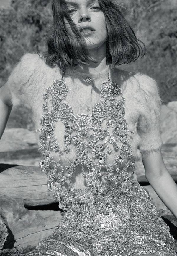 走出阴霾,沐浴阳光,坚忍不拔的现代女性愈发果敢强势,仿佛自带光芒,一身铠甲熠熠生辉。 拨去历史的尘埃,那些旧时光中的吉光片羽,经过重新连接再造,成为崭新的耀目之源。浅色针织短袖上衣、水钻装饰胸衣、锁子甲半裙、腰带均为Paco Rabanne 循着风吹拂的方向。汲取大自然在不动声色之间赋予万物的能置。黑色羊毛及踝无袖礼服裙Dior;黑色羊毛长手套UGG;黑色羊毛针织头套Honse Design