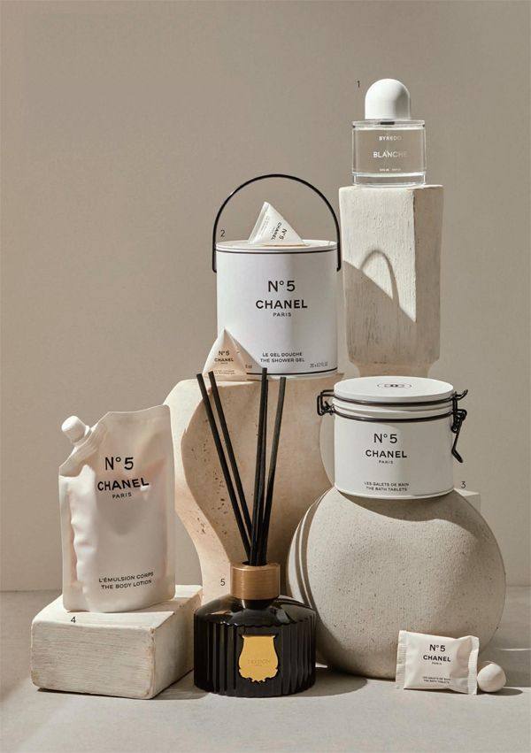 1.Byredo纯真年代淡香精收藏家版¥ 2.335/50ml不同以往的瓶身和白色瓶盖,使经典香氛重焕盎然生机,在纯粹、纯净的特质中凸显张力,醛香和玫瑰香气的碰撞诠释着白色织物和洗涤用品的鲜明对比。2.Chanel五号沐浴凝露¥635/20*6ml以“漆桶”为灵感,将20支独立包装的沐浴凝露作为颜料涂抹全身,泡沫细腻丰富,使肌肤展现出玫瑰色的光芒,散发5号香水的馥郁气息。3.Chanel五号沐浴香