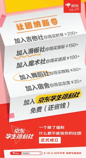学生群体是社会中最具活力和潜力的消费群体,把握好学生群体的消费市场,找到贴合学生群体的消费场景,对于想要在年轻人消费市场中站稳脚跟的品牌来说至关重要。趁着开学季,京东以大学生熟悉的“社团”为切入点,专门为大学生打造了能提供购物优惠的“京东学生福利社”。 在活动预热阶段,京东通过发布海报官宣“福利社”的成立,在海报上将“京东学生福利社”的优惠折扣与参加学校社团所需的花销进行对比,在